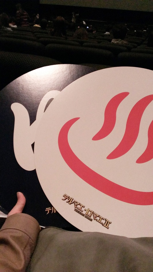 劇場の入り口で応援アイテム、(なんか丸い厚紙に、温泉マーク