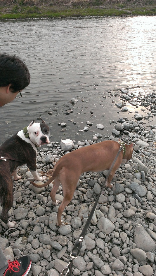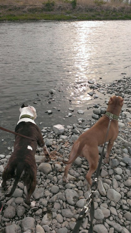 川の水を目の前に、泳ぎたくなるイヌ二人。