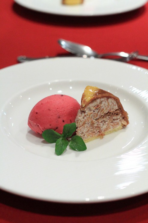 最後のデザートは、ラズベリーのシャーベットと、食感のいいナッツのケーキでした。