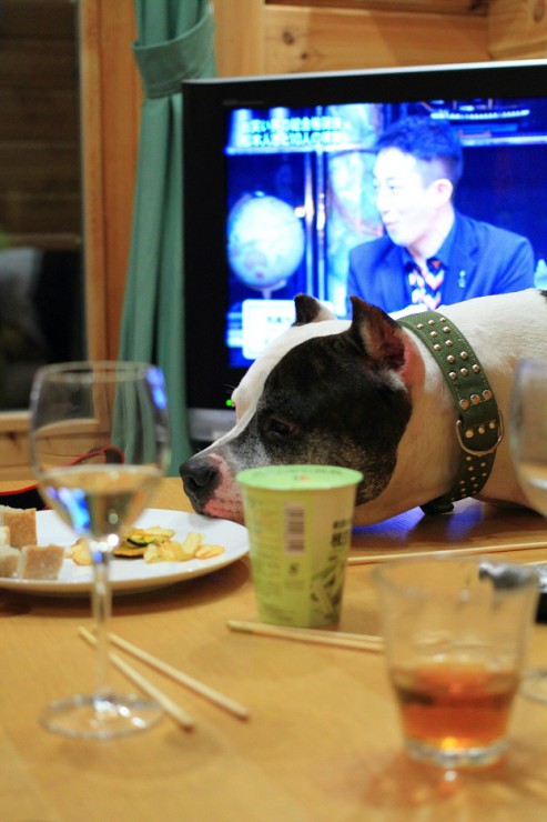 取りあえずは 落ち着いてきたので、 お利口にテーブルの横に座らせ、