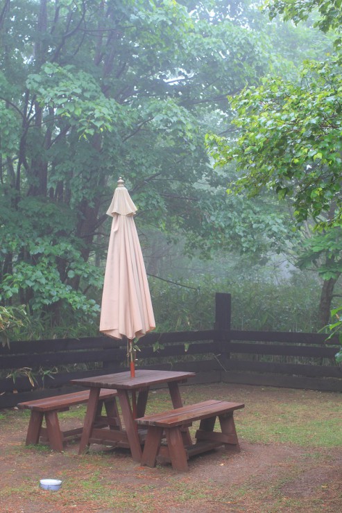 外は霧がたちこめて、バラバラと草木に水が落ちる音が聞こえてきます。