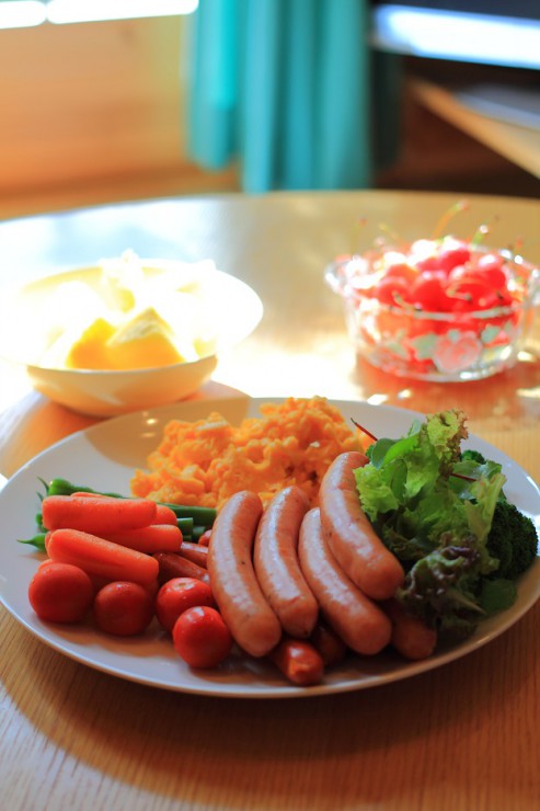朝食は、前日のフォンデュの余り食材にフルーツ、