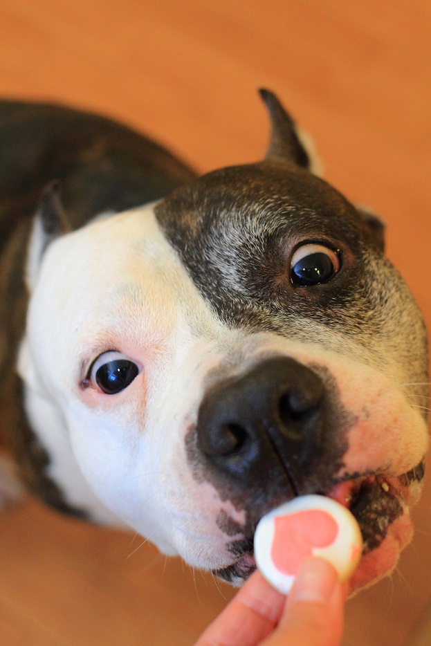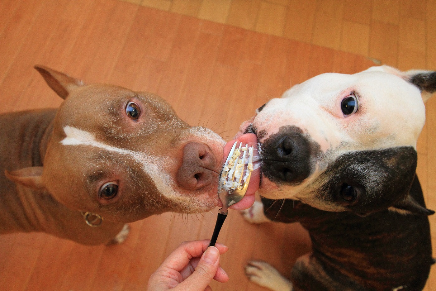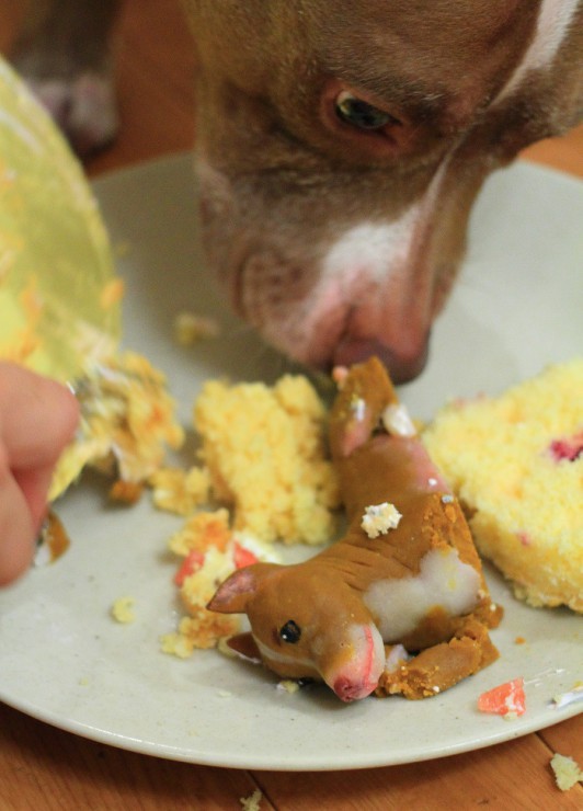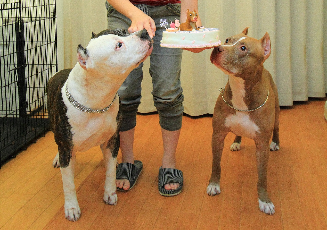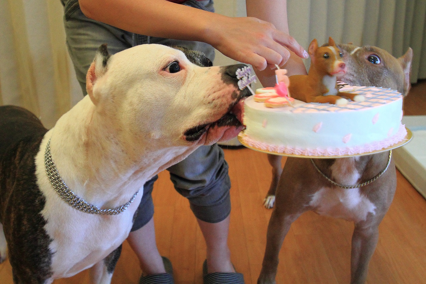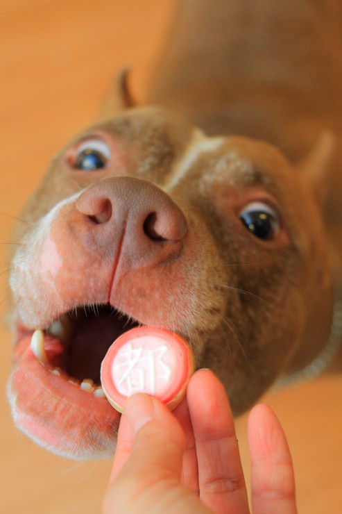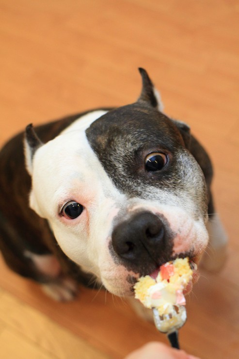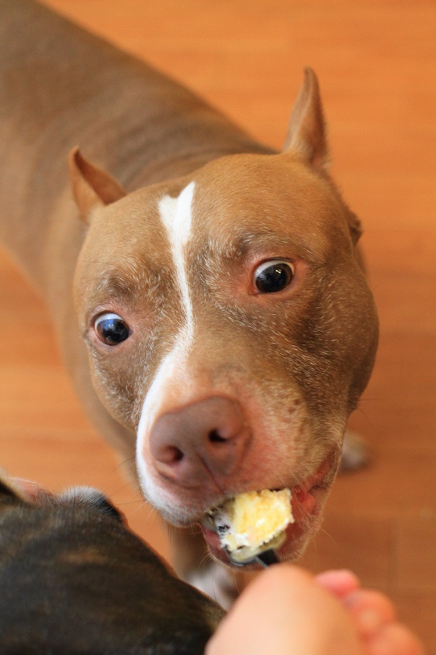 実はケーキが好き過ぎて、自由に食べさせるとイヌ達はバトルを始めるので、