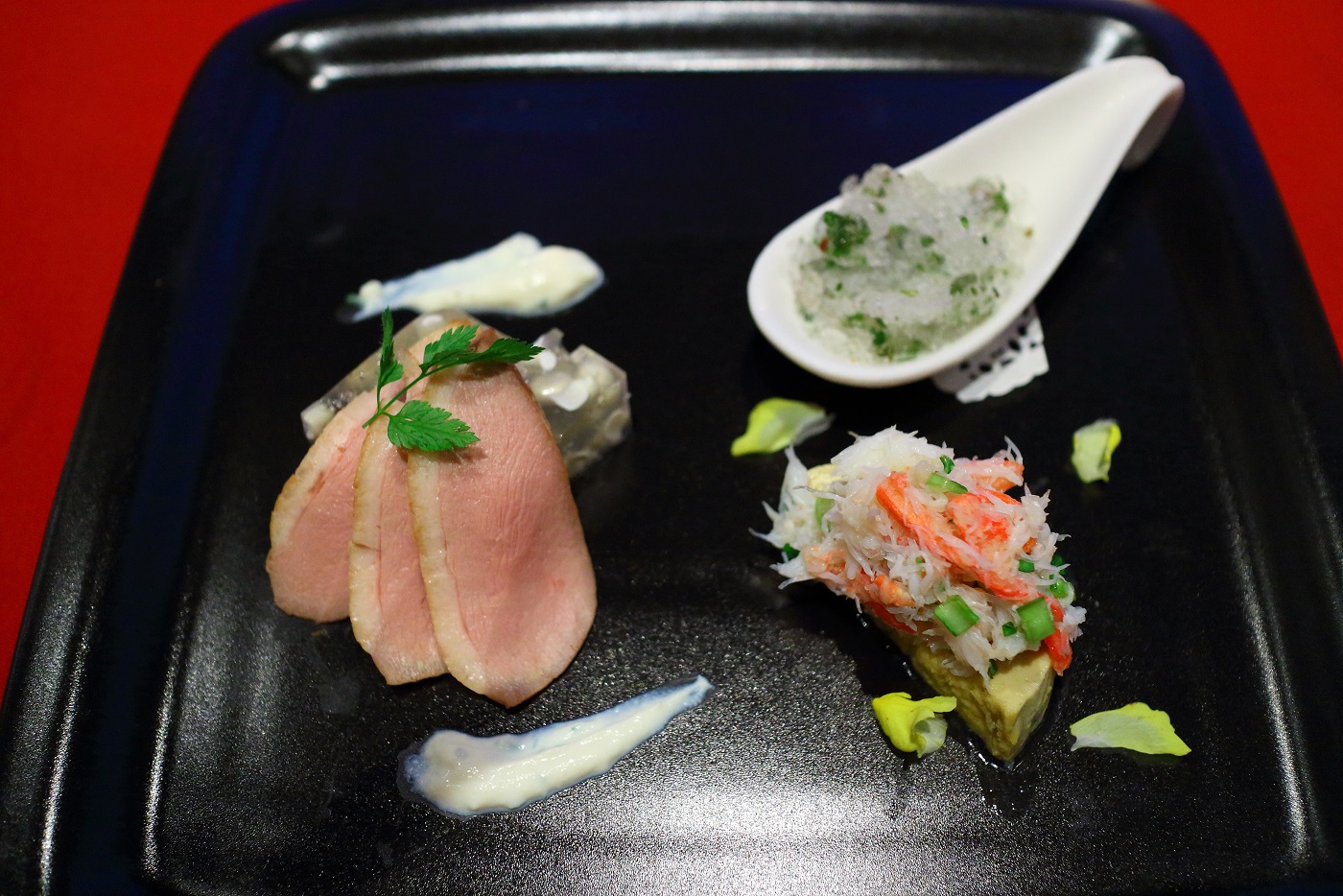 ・鴨胸肉の燻製、鳴沢産コーンと白ワインのゼリー、忍野豆腐と大葉のソース