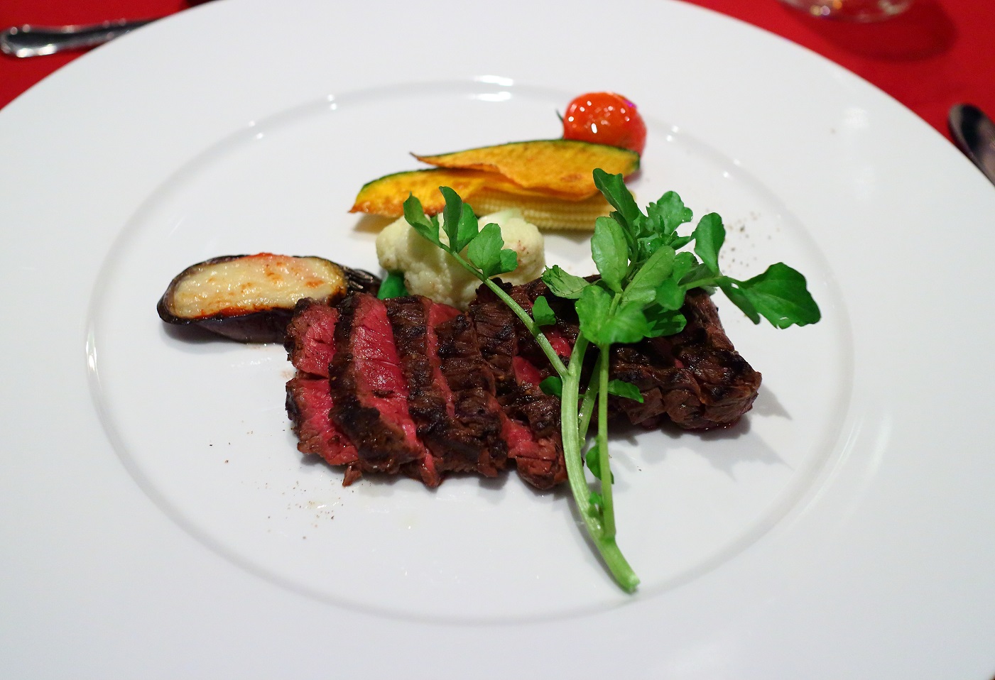・オーストラリア産牛ロース肉のタリアータ、雲丹のカタラーナ添え、生食用春菊のサスサヴェルデ
