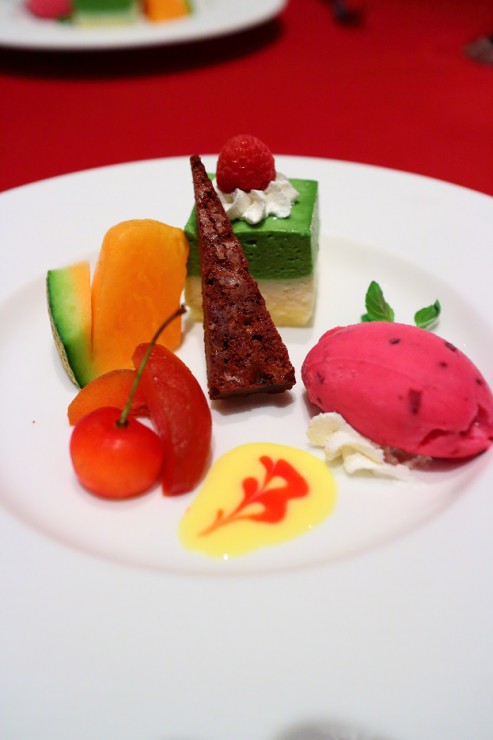 ・抹茶のスフレケーキ、カシスのシャーベット、チョコレートブラウニー、桃のコンポート他
