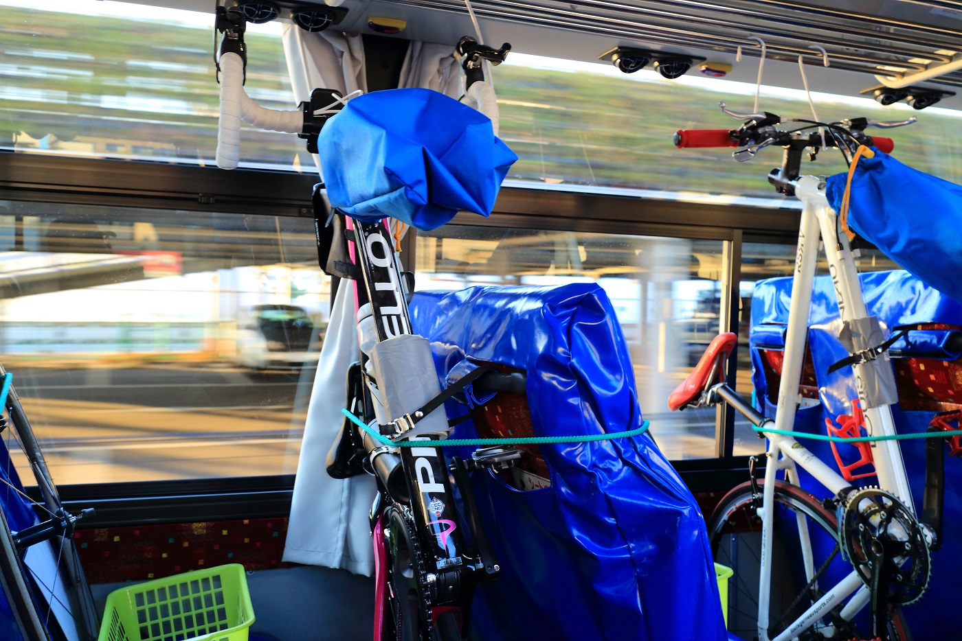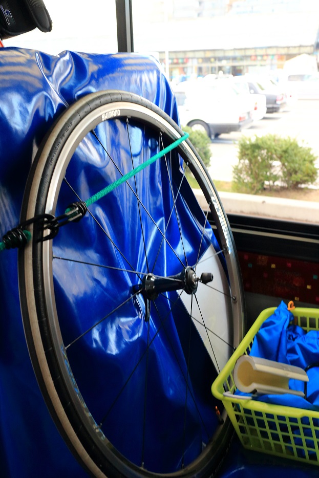 前の座席の背もたれに自分の自転車の前輪を置き、フレームと一緒に紐で固定し、
