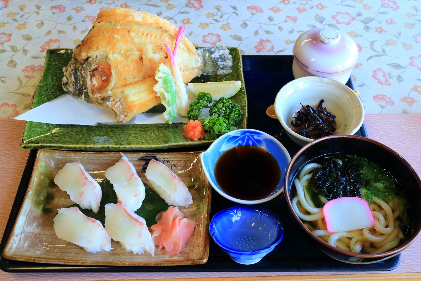 マハタの握り寿司・ヒラメの唐揚げ・うどん・茶碗蒸し・小鉢と、思わずガッツリ飯を注文してしまいましたが、