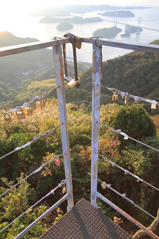 亀老山展望公園に来た人は、訪れた記念に展望台の手すりに錠前を付ける。