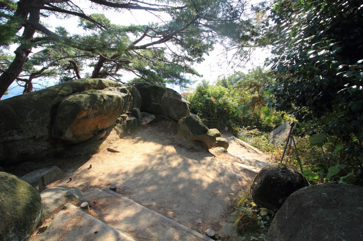 小石で岩を打つと「ポンポン」と鼓のような音がすると説明書きがあった。