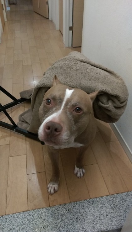 この前、ついに朝の お見送りに、毛布を被ってマ~さん登場!