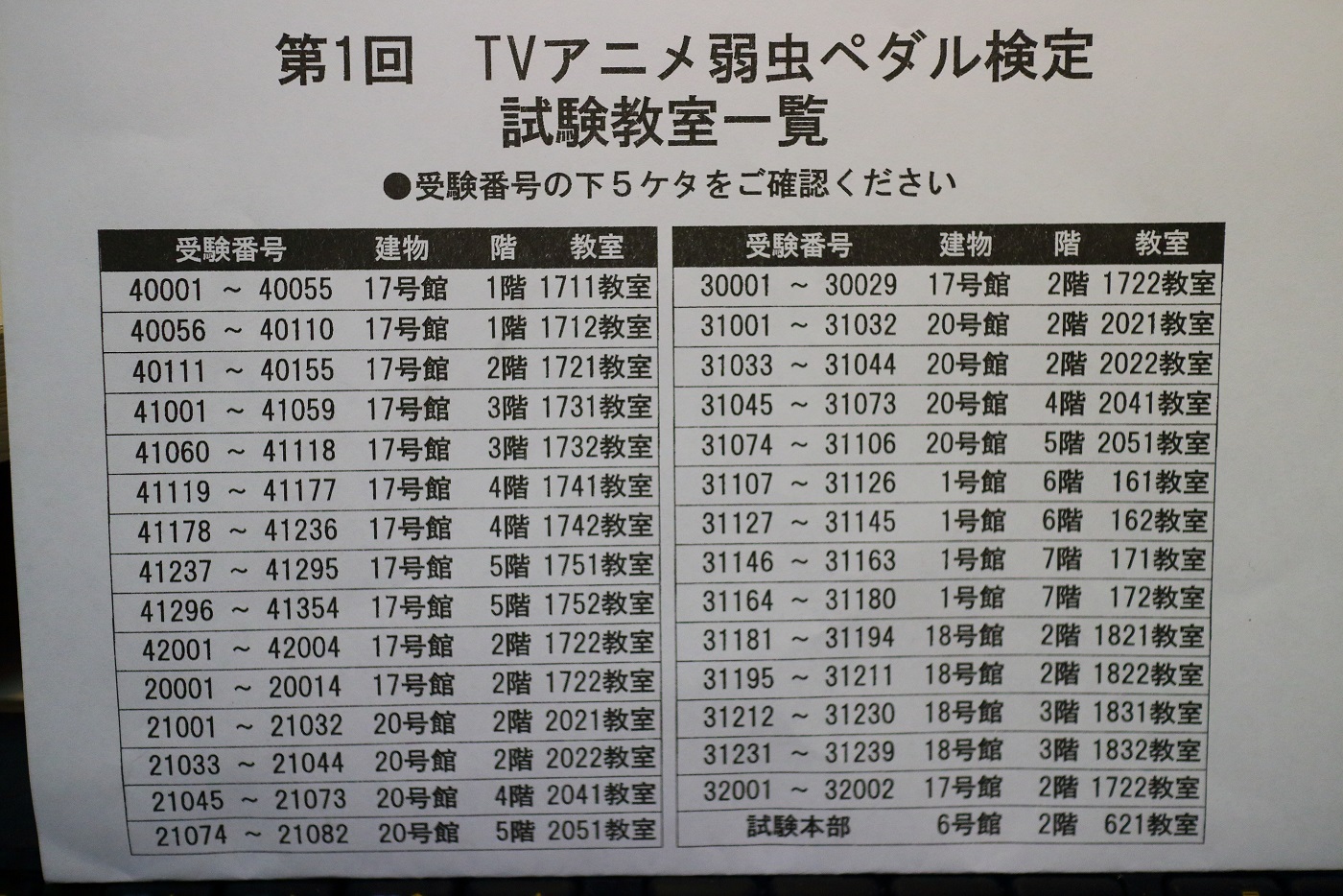試験会場入り口では係員が、試験教室一覧を配布しており、