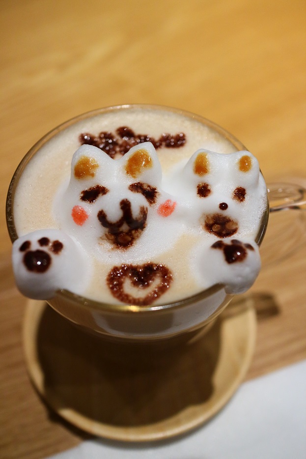 「アーモンドキャラメルラテ」のラテアート、可愛くて飲めないバージョンでございます♪