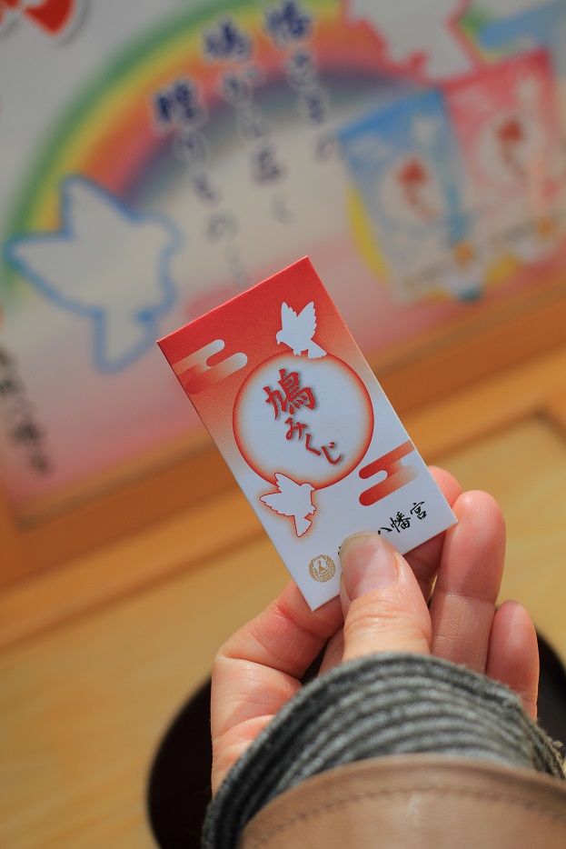 封を開けると、末吉と書かれた おみくじと、赤い鳩のお守りをGET!