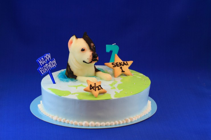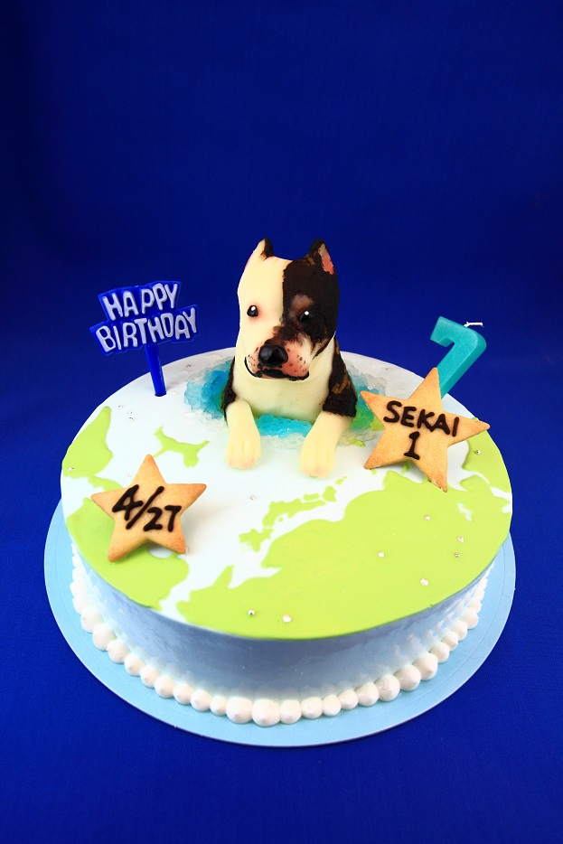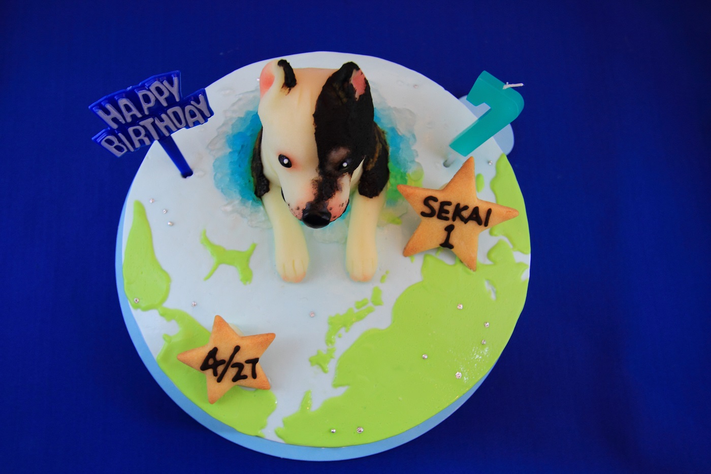 デザインは、地球儀の様なケーキに いちくんの立体をのせ、