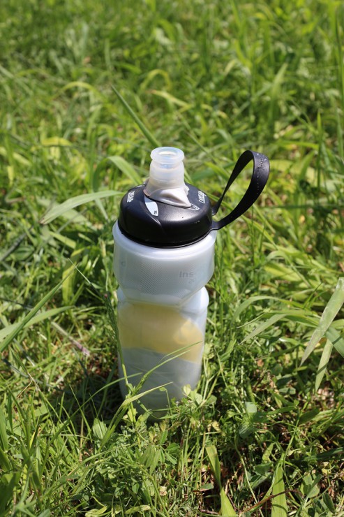 腰に自転車用のウォーターボトルをぶら下げて、