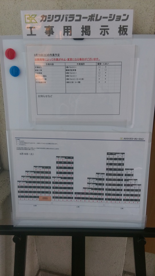 朝起きて、イヌ達と散歩をした際にエントランスホールに置かれた工事用掲示板を見ると、