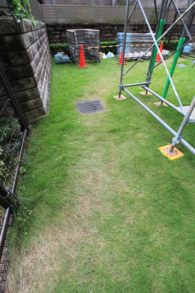 庭は人や機材の出入りにより、早い段階で芝生が痛みはじめ、