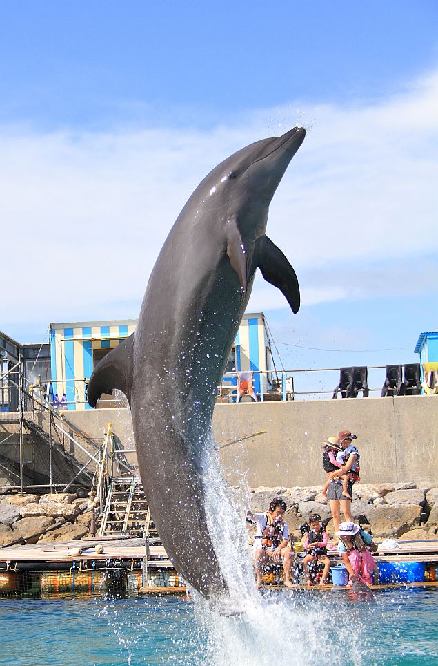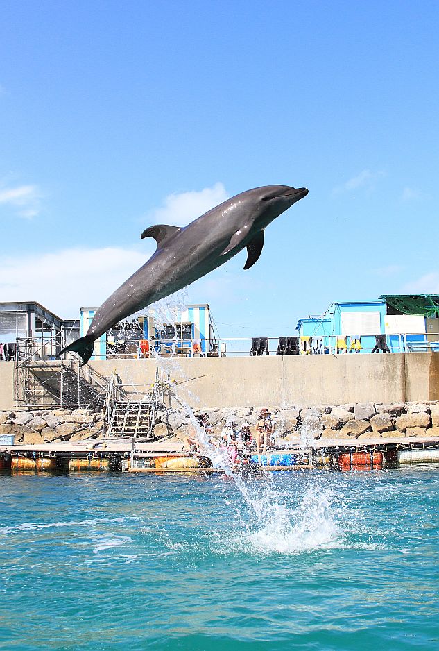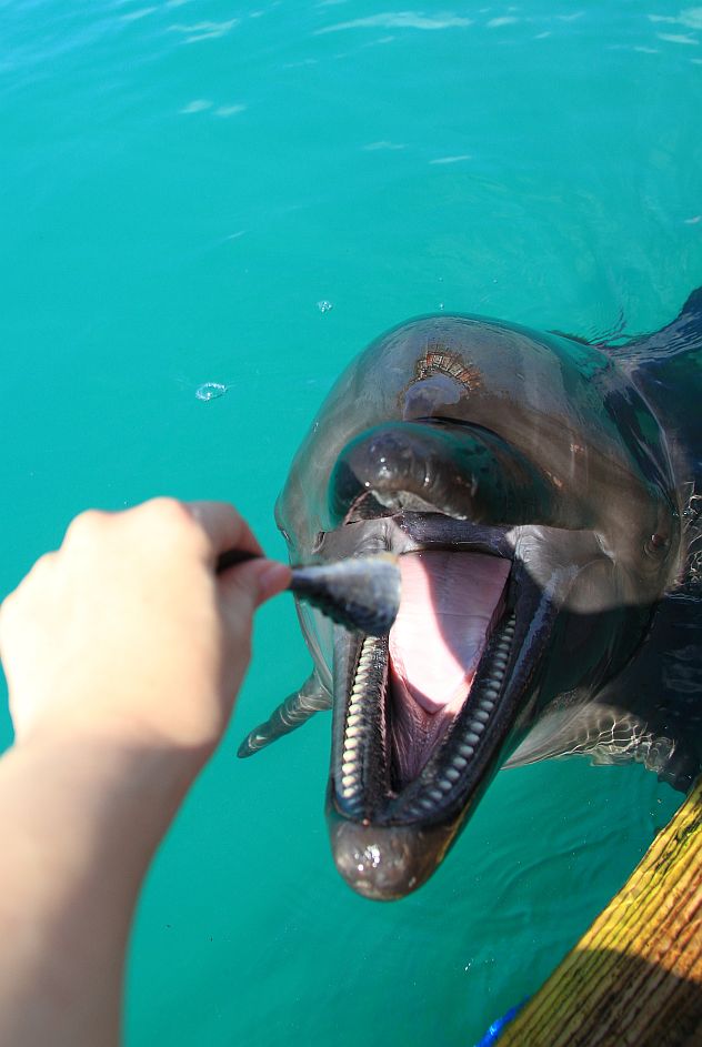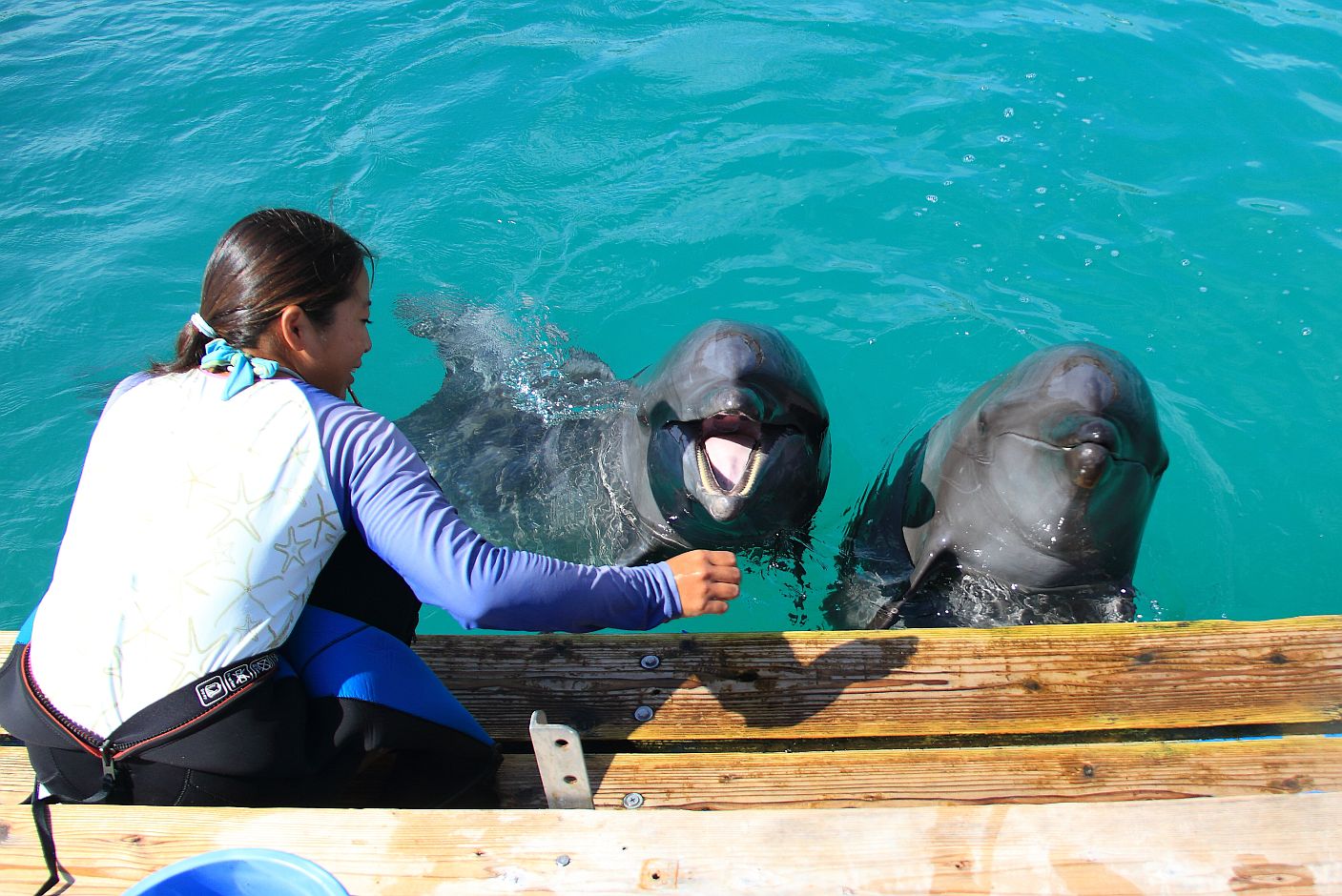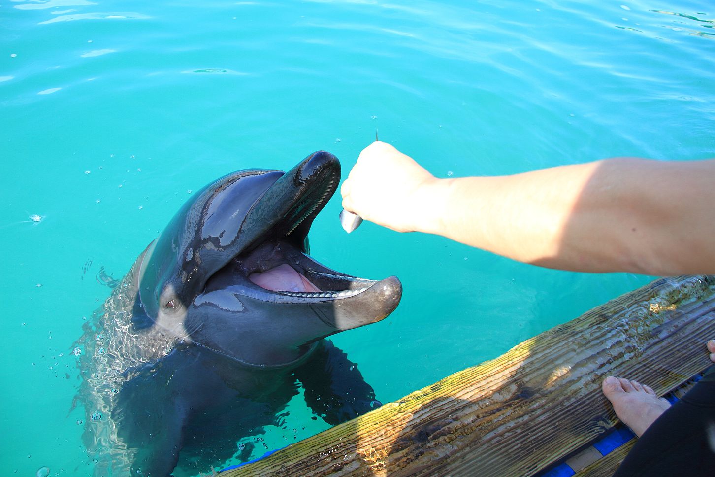 イルカにエサをあげたり、握手やジャンプなどの合図を出して