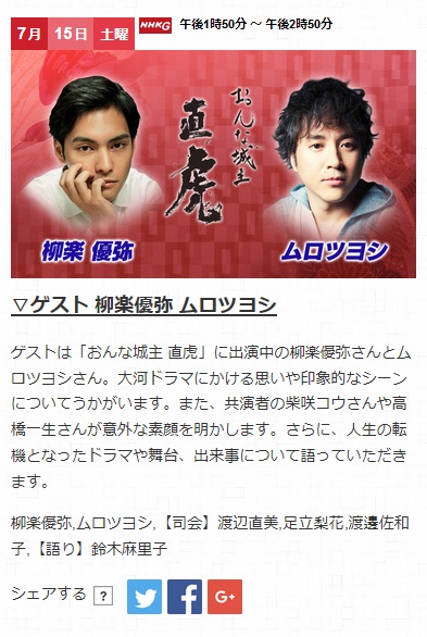 現在放送中「おんな城主 直虎」繋がりで呼ばれた柳楽君とムロ君ですが、今この二人がセットだと、銀魂の宣伝の様に見えますね~ww NHKで映画の宣伝などする訳ないですが ^^