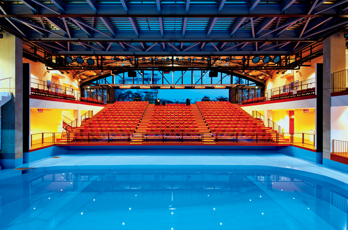 プールエリアは天井に床が吊ってあり、それを降ろして桟敷席を設置。