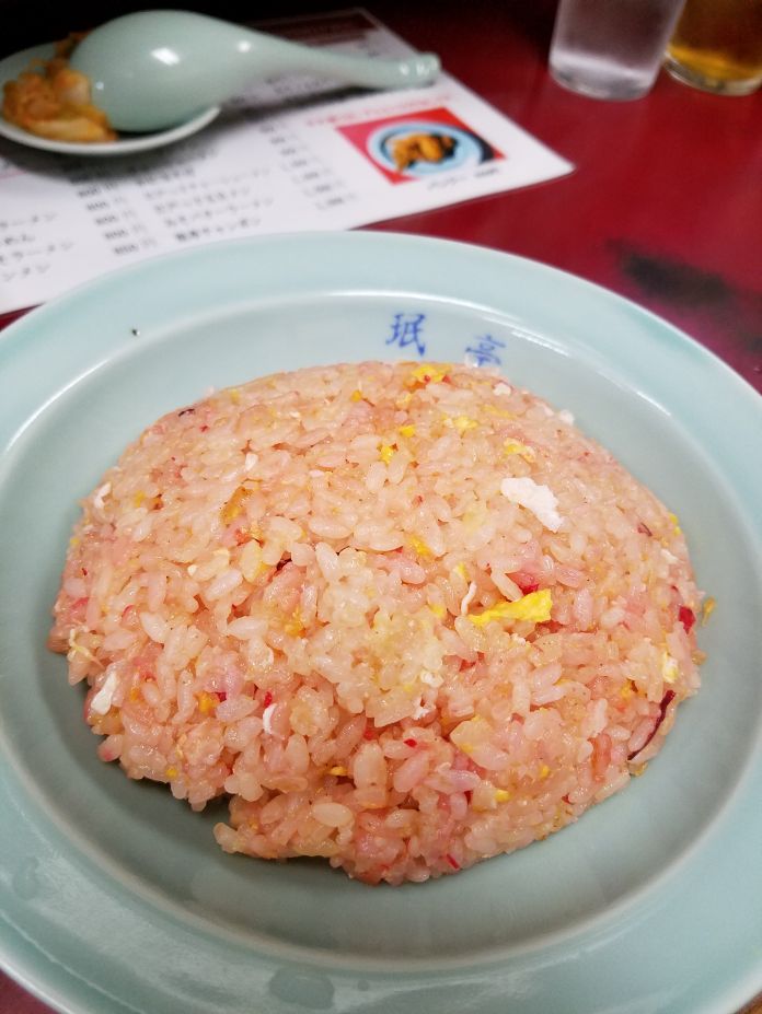 ピンクのチャーハンを食べ、