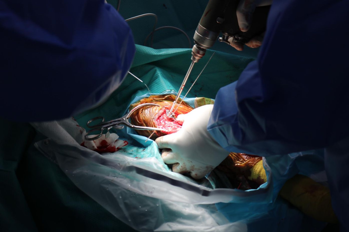 脛骨の先端を、専用のノコギリで切断しようとしてるとこですかね・・・。