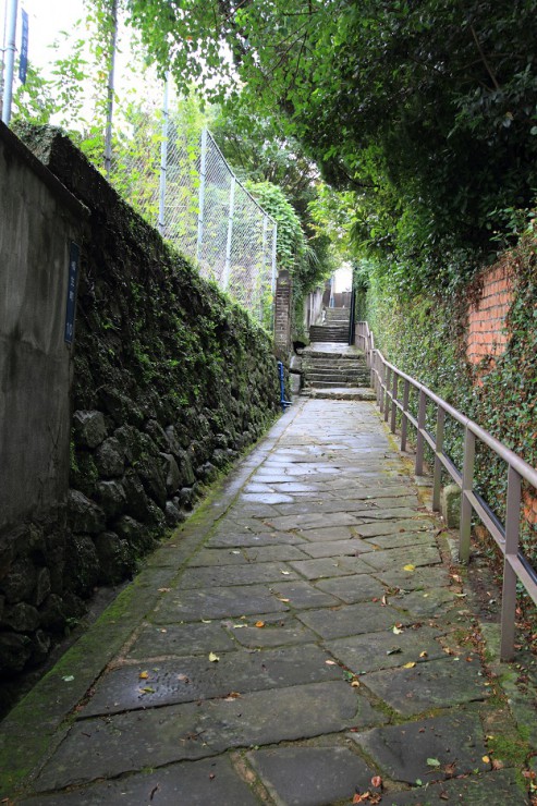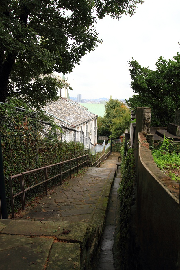 私達が歩いておりますのが、初日夜に通りかかった大浦天主堂の脇道。