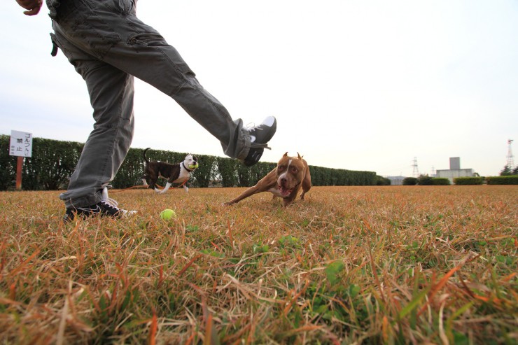 フェイントして遊んで、蹴るとすさまじく走って行って、また蹴るふりをすると大喜び。