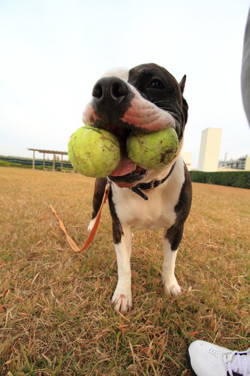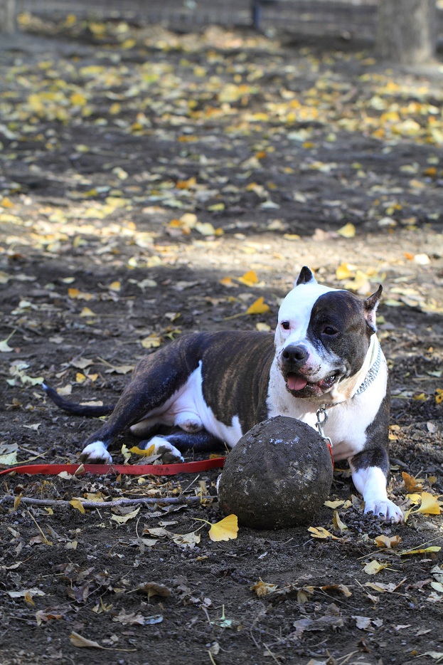 一方いちくんは、ランで見つけたボールを咥え独り遊び。