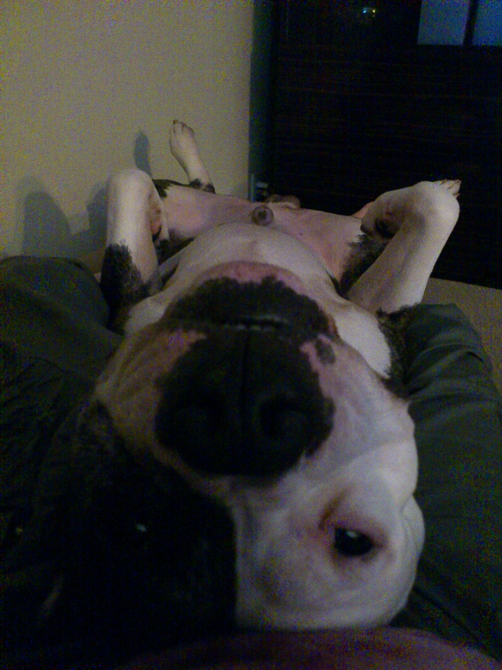 ↓そんでもってこれは、そんな私を股の間から見つめ不気味に笑うイヌ一匹(;´∀`)