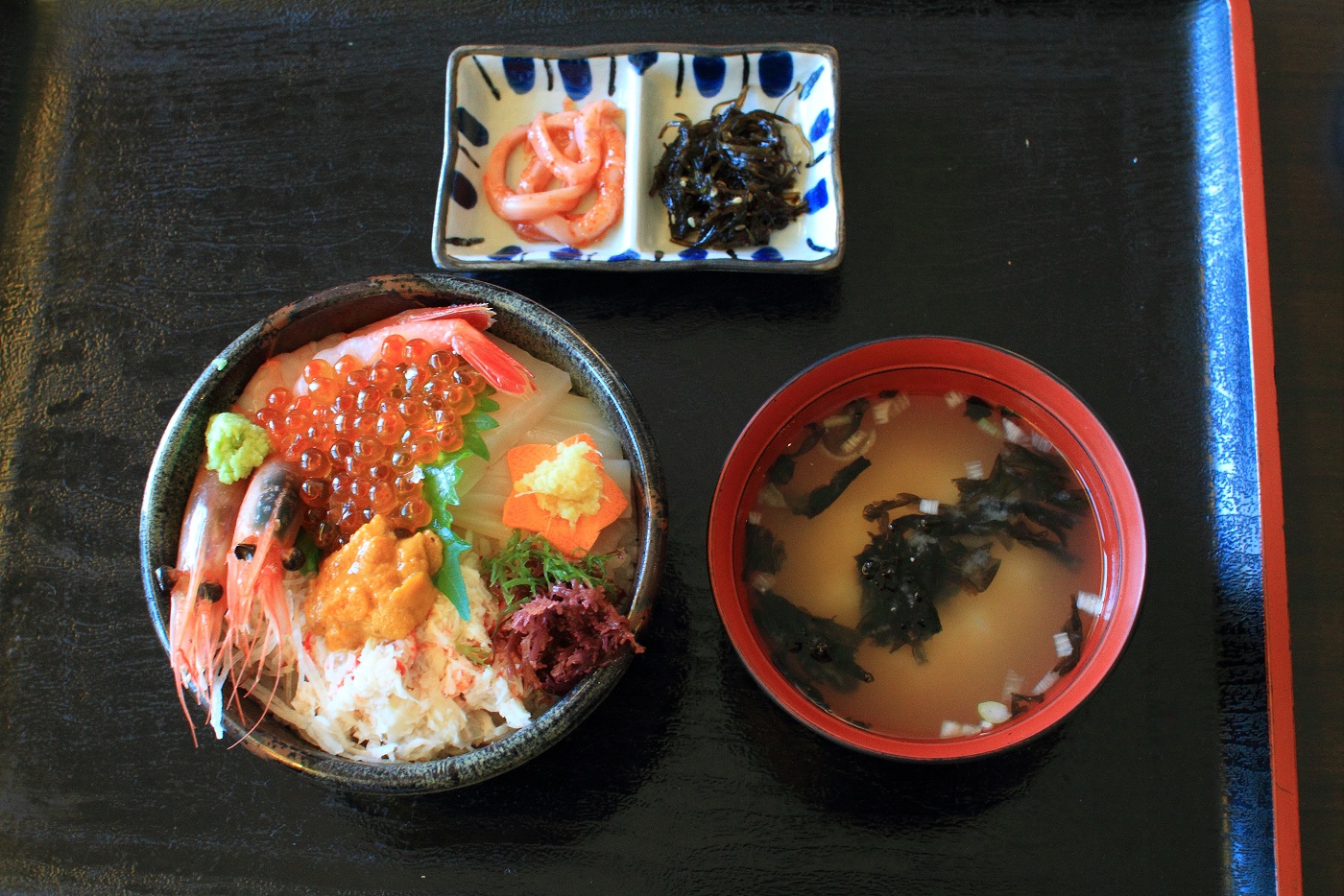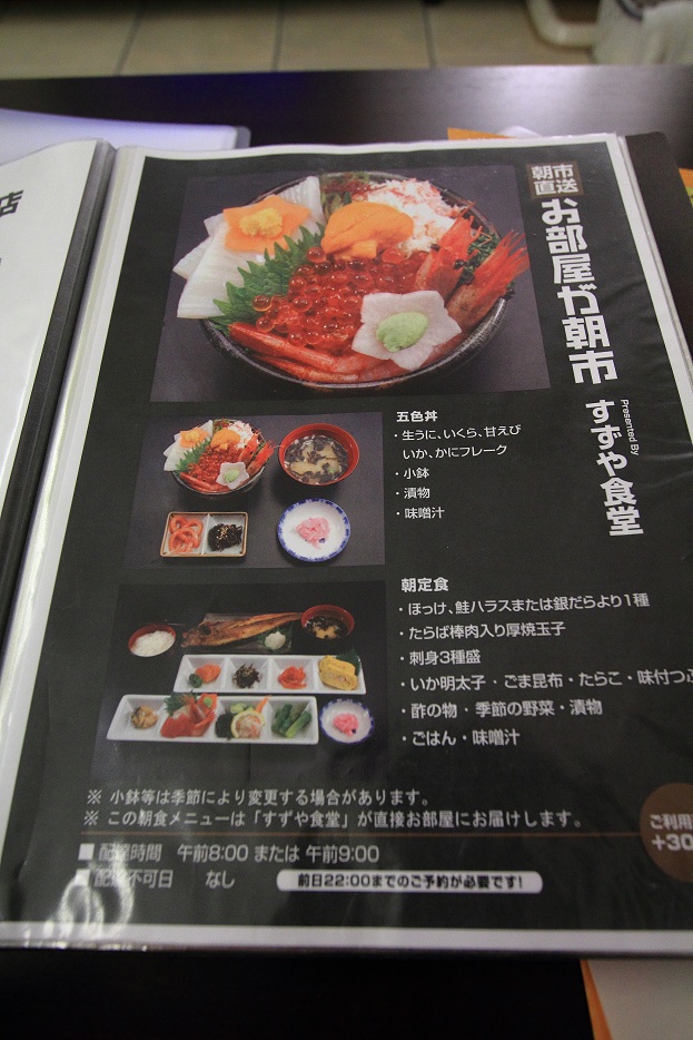 朝市の定食、又は海鮮丼を、お部屋まで運んで貰って食べる選択肢があります。