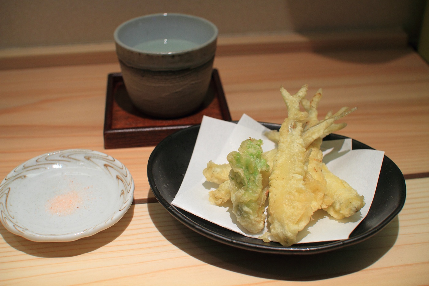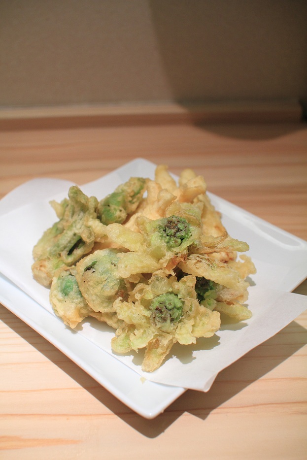 たけのこ、芽キャベツ、ふきのとう、たらの芽が盛られた、「春野菜天」