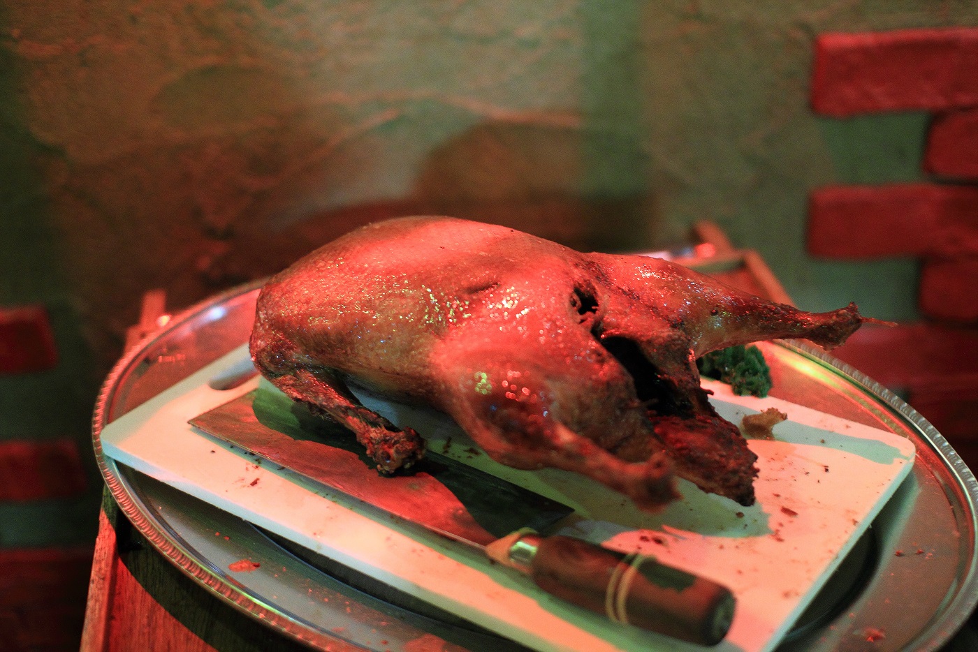 赤い照明効果に加えて、北京ダックを写した角度、