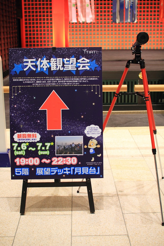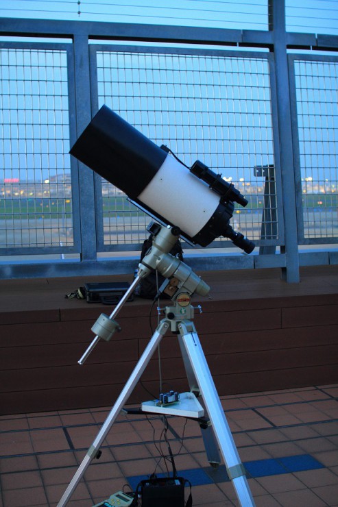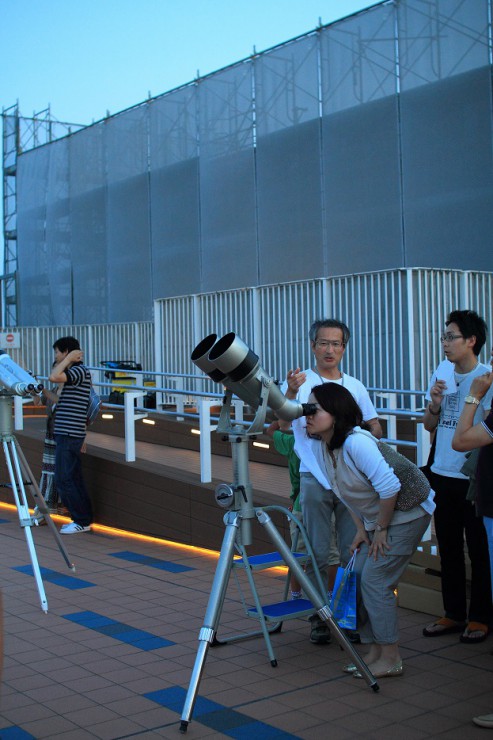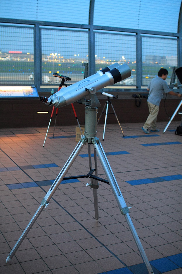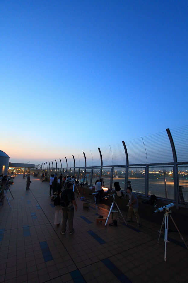 空港の展望デッキにズラリと並んだ天体望遠鏡や双眼鏡で惑星や星を見ましょう!的な会です。