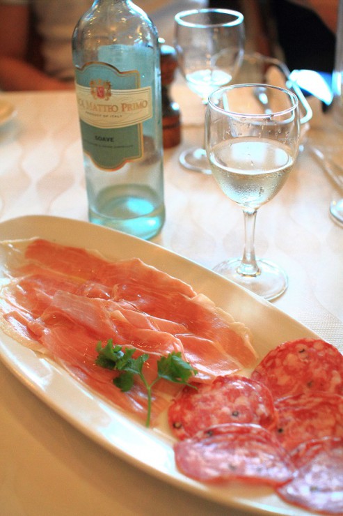 女子は、トリノ産粗引きサラミとパルマ産プロシュートでワインを飲む。