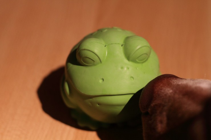 ひとたび彼(カエル)を天高く掲げればワンコ達の注目を集め、