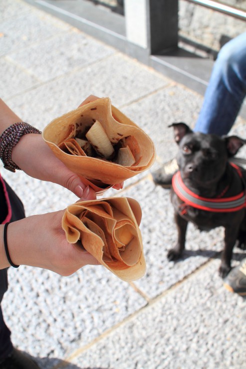 イヌ達の くれくれ攻撃に遭わないようにTAKO&TAMAは少し離れたところでクレープを食べました。