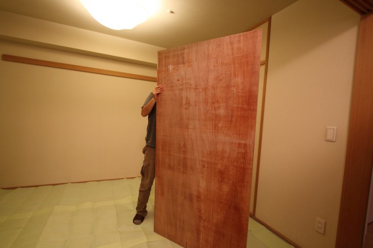 次に、TAKOさんの作った設計図どおりに お店でカットしてもらったコンパネを敷きます。