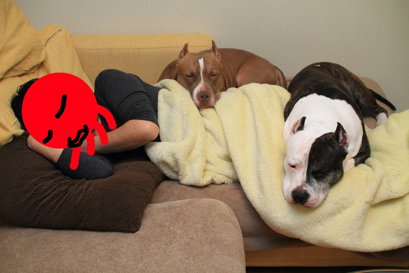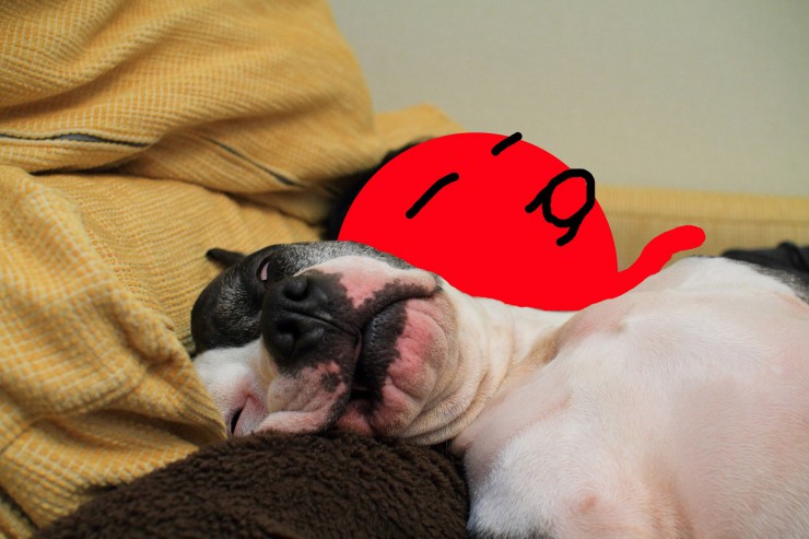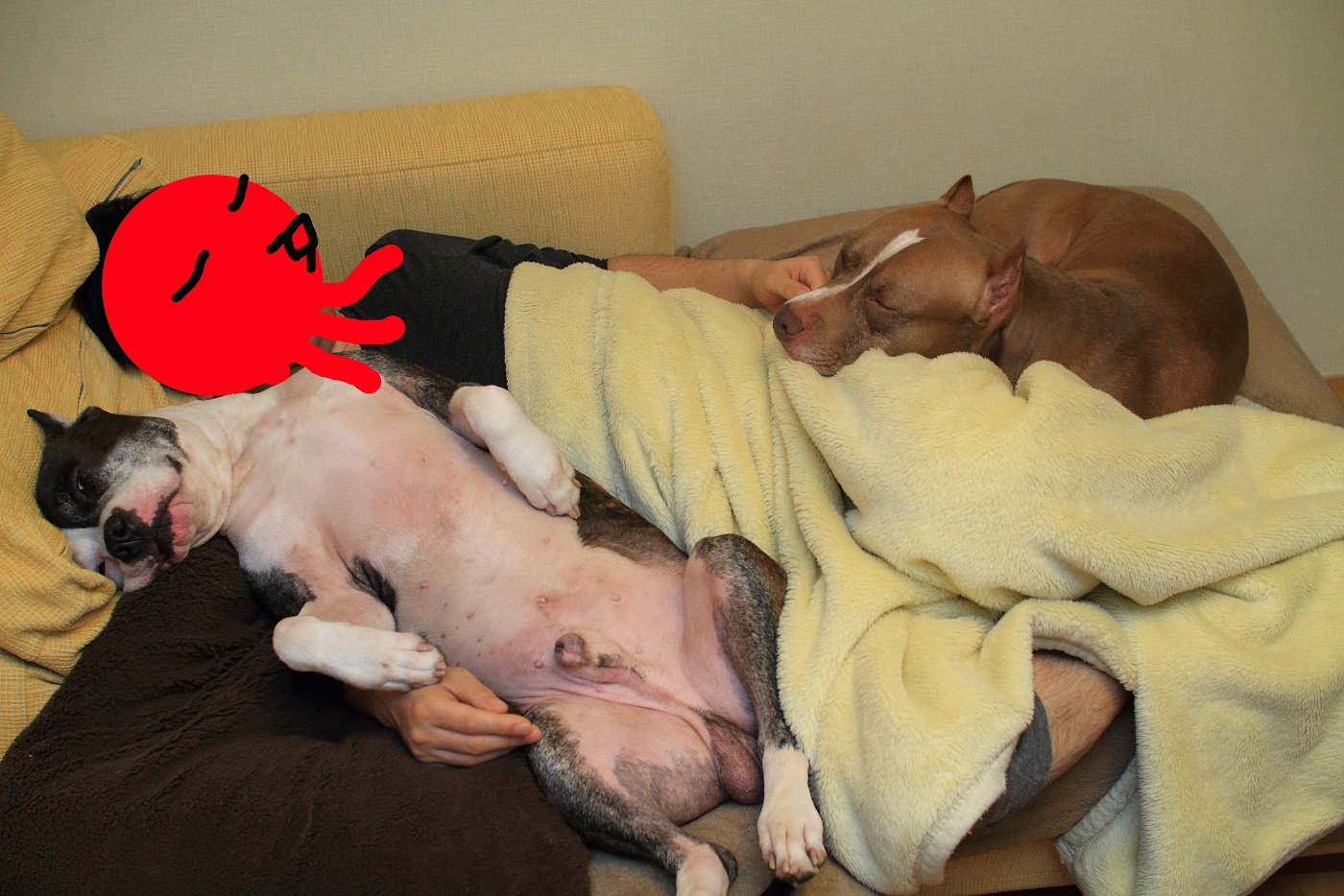 イヌ達の重みで苦しくなって、退かそうとするのだけれど微動だにしない。